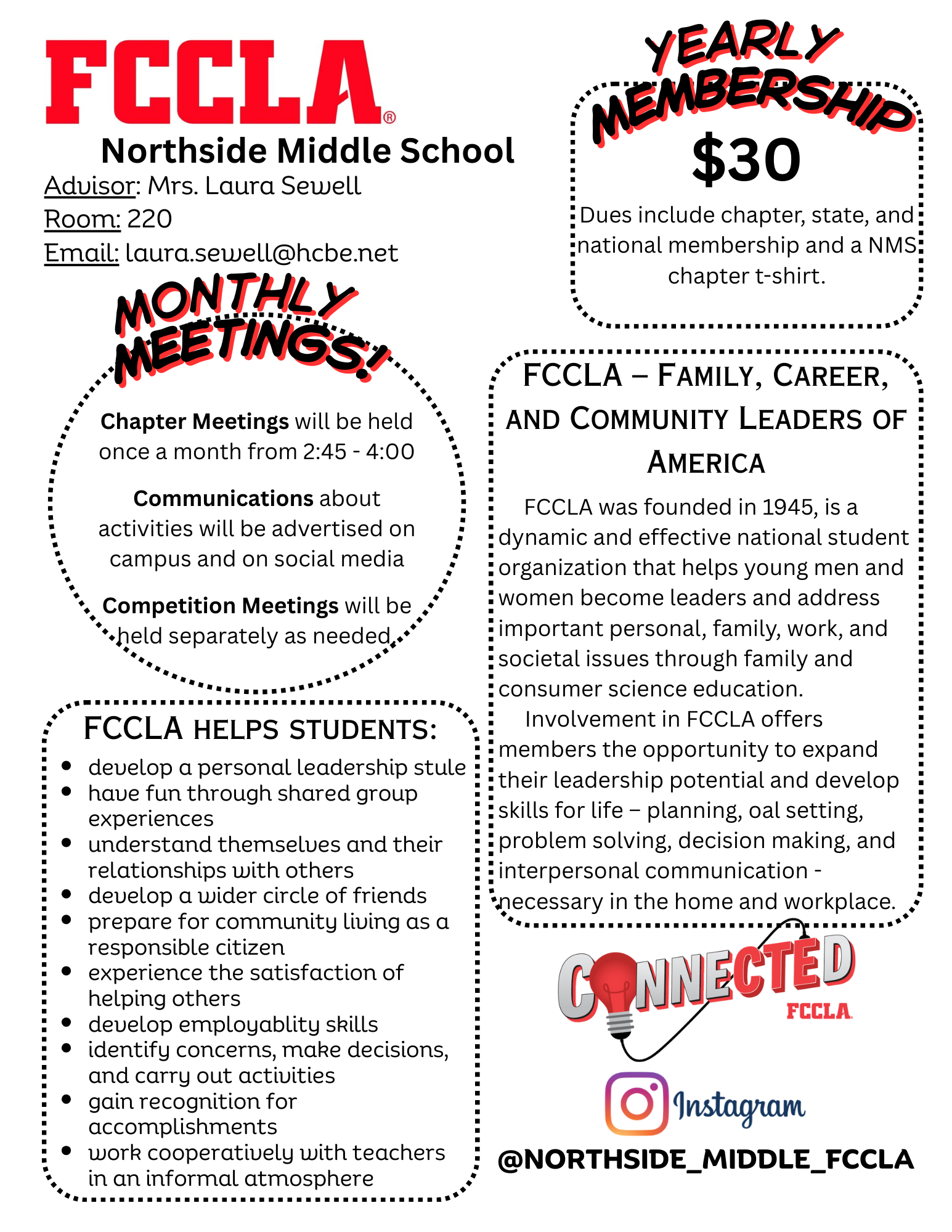 Northside Middle School FCCLA is always looking for new members! This year (2025-2026), we recruited 40 new members. We always look forward to welcoming new people into the chapter!